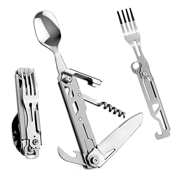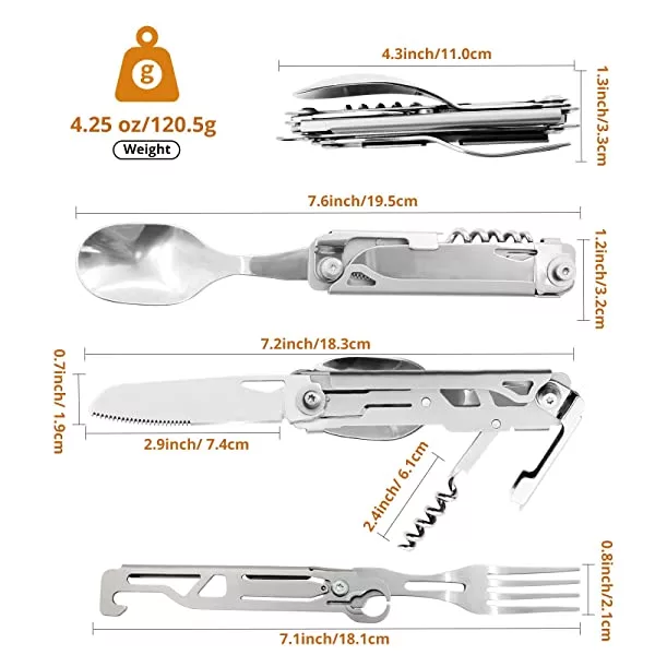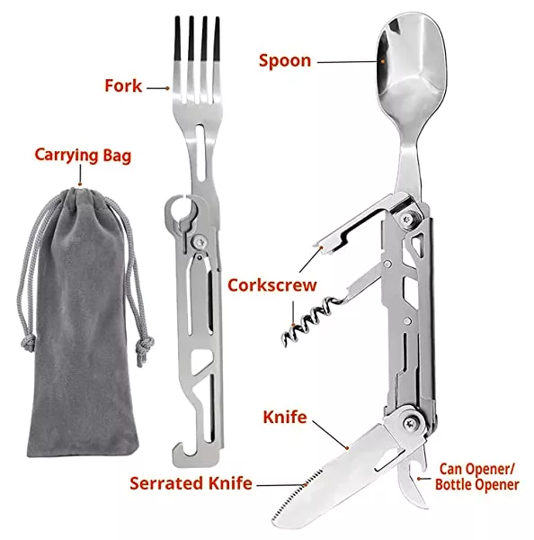 HONZIN Camping Besteck Utensilien, 5 in 1 Multifunktions Klappbesteck, tragbares Edelstahl Besteck Set für Reisen, Wandern, Rucksackreisen, mit Kordelzugbeutel